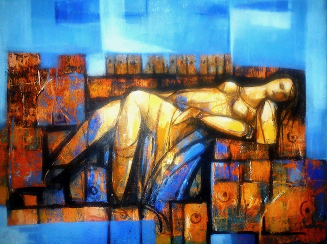 Taghreed’s father, Kadum Ibraheem, standing next to one of his paintings. He also painted the feature image for this article.